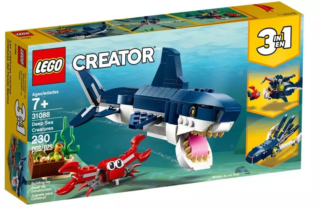 We have not built this set, but the reviews on Lego.com are great. Deep Sea Creatures comes with instructions for three builds, and there is a fourth design available for a whale, too. The kit includes a crab, squid, and angler fish. Reviewers of this kit even mention that the anglerfish will fluoresce under actinic/UV light. Cool!