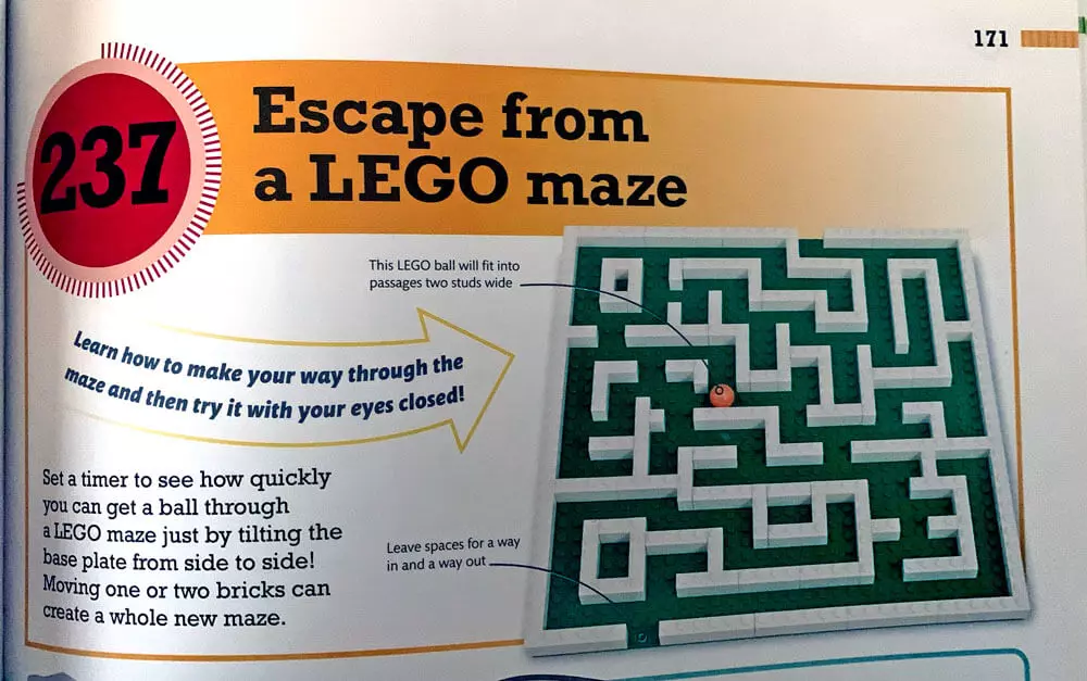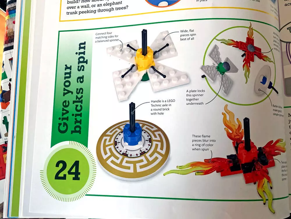 We've had this book in our personal collection for about a year. It's a very high-quality, hard-covered book with an extra flap for marking your page. The red square (shown on the bottom) is a functional activity timer and selector. Simply push the "?" button and the screen display will cycle through and land on a number between 1 and 365. This is your activity selector, simply flip to that activity number and get to building.